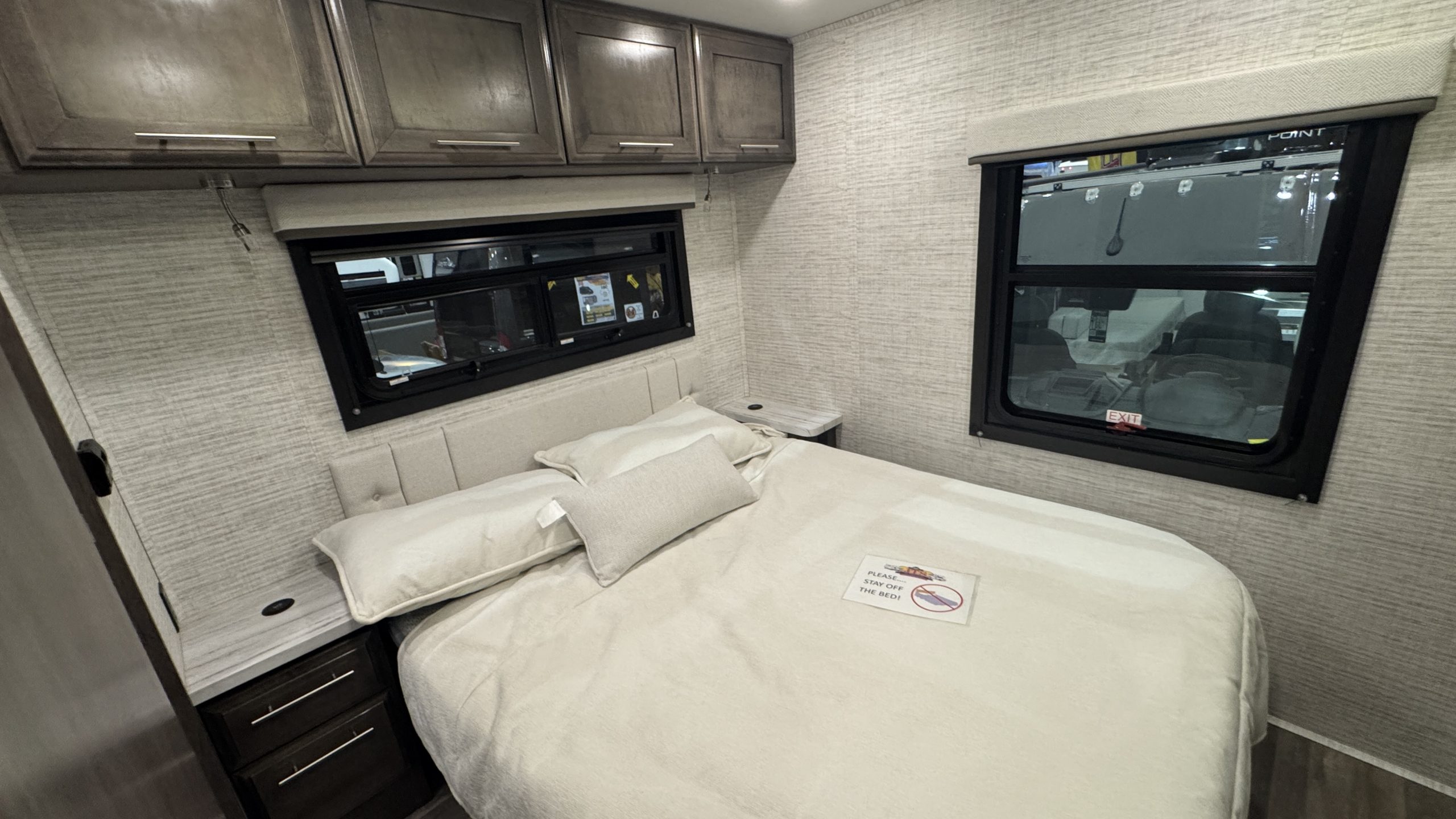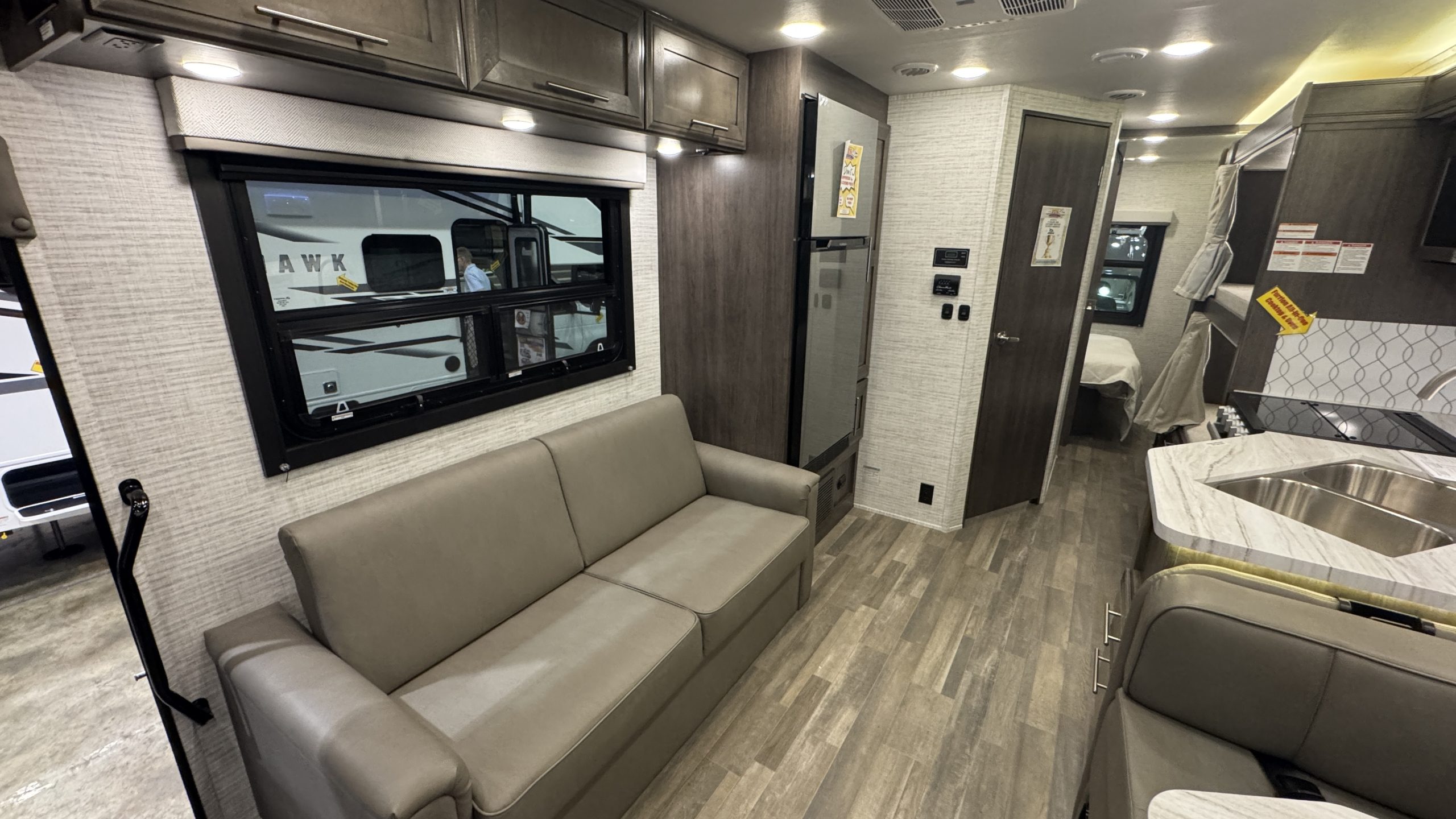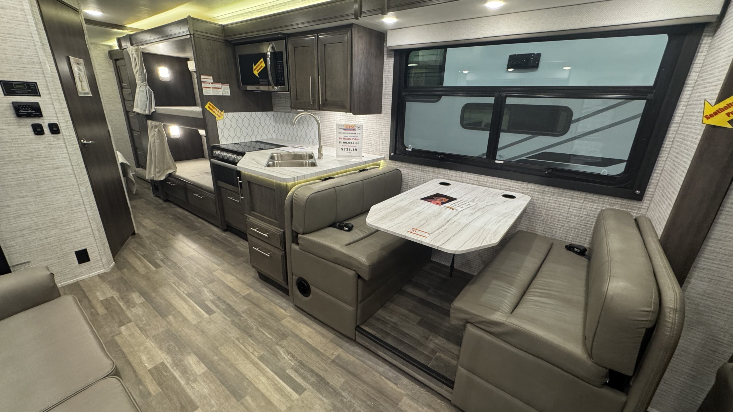 A queen-size camp bed in the back bedroom, a queen above the drivers seat, bunk beds, and a dinette that converts into a bed, as well as a sofa that lies flat. Kitchen with 4-burner stove, sink, 12v good-sized refrigerator, and a microwave. Powered awning. Fun for the family and friends!